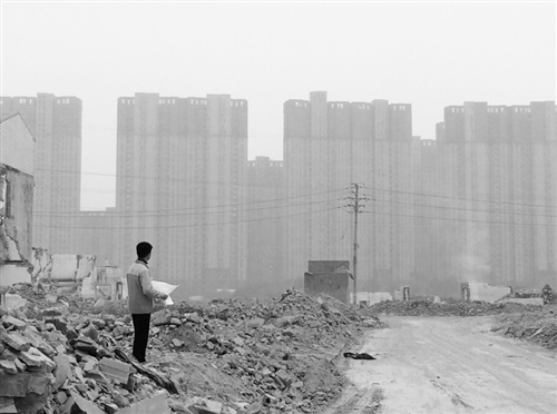 2014年10月31日,一名建设者查看现场规划情况,驻足待建的拆迁废墟上眺望对面的现代化住宅。